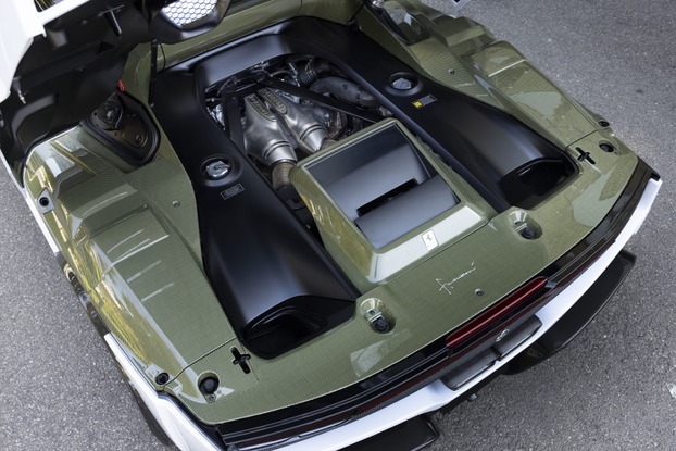 Inside, particular attention was given to the use of Kevlar, a material that strongly recalls the F40. The carbon-Kevlar has been reinterpreted and redeveloped for this project, and features in the footwells, behind the seats, and on parts of the floor mats. This distinctive material is also used for the steering wheel, some dashboard inserts, the engine bay, and the luggage compartment. The upholstery features a combination of Charcoal Alcantara® and a red Jacquard technical fabric, while the Prancing Horse on the headrests and the woven SC40 logo give the seats a contemporary and exclusive look.